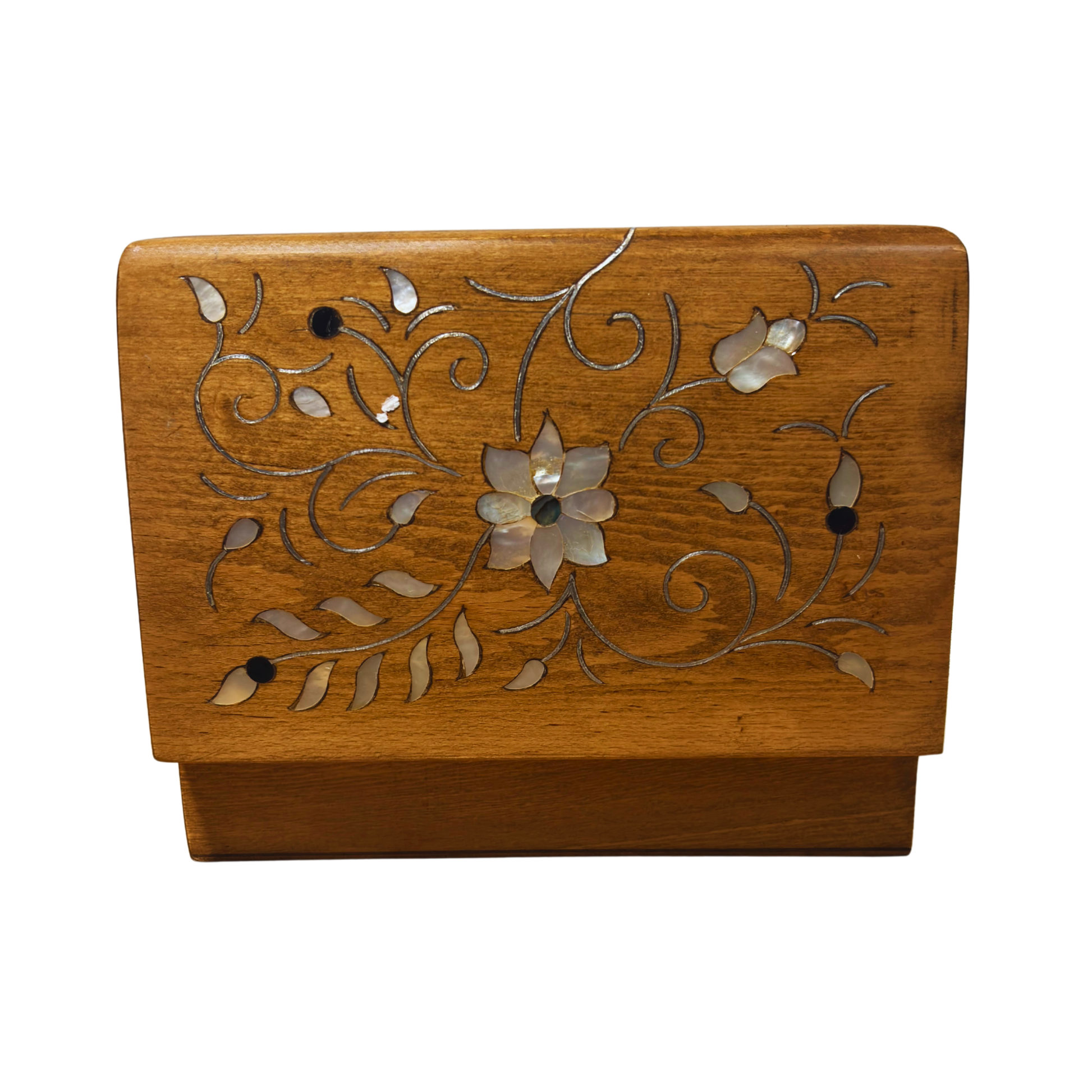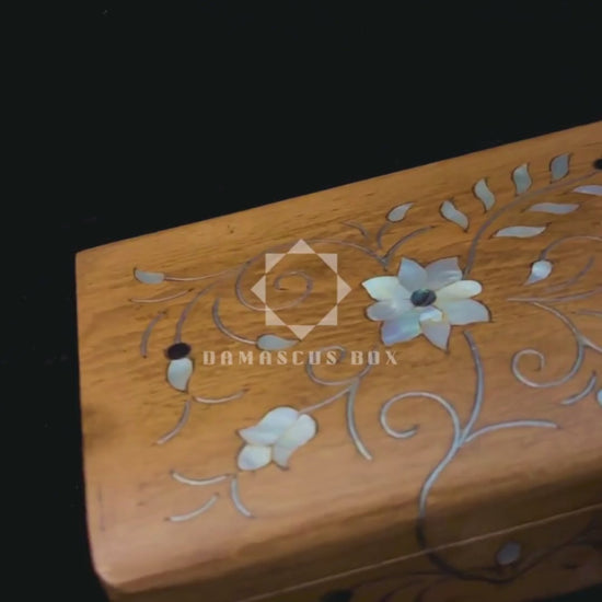 Mit einem hellen Walnuss-Finish, echter Perlmuttintarsie und weinrotem Samtfutter vereint diese Box hochwertige Materialien mit traditioneller Handwerkskunst aus Damaskus. Das Ergebnis ist ein zeitlos elegantes Kunstobjekt von besonderem kulturellem Wert.