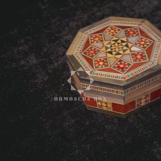 mini octagonal mosaic box, handmade Damascene box, mother of pearl jewelry box, Middle Eastern keepsake, walnut wood box, unique gift idea, artisanal wooden box, cultural mosaic art, Damascus box, Syrian box, gift for her, gift for him