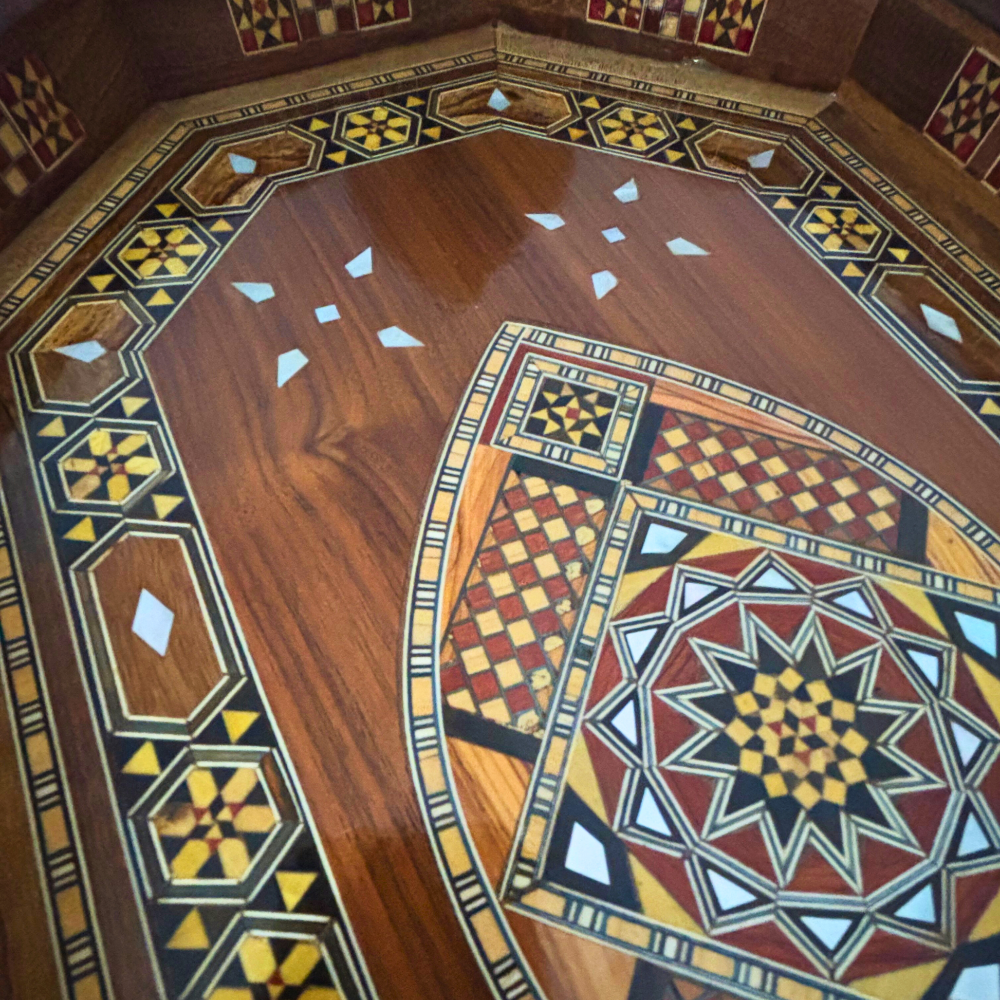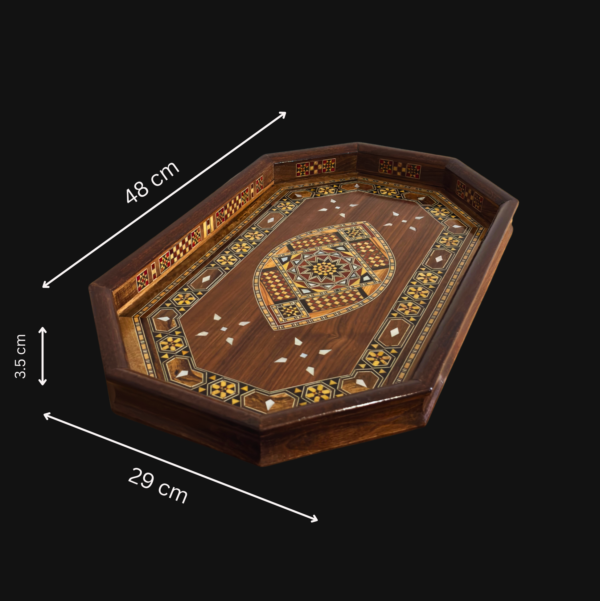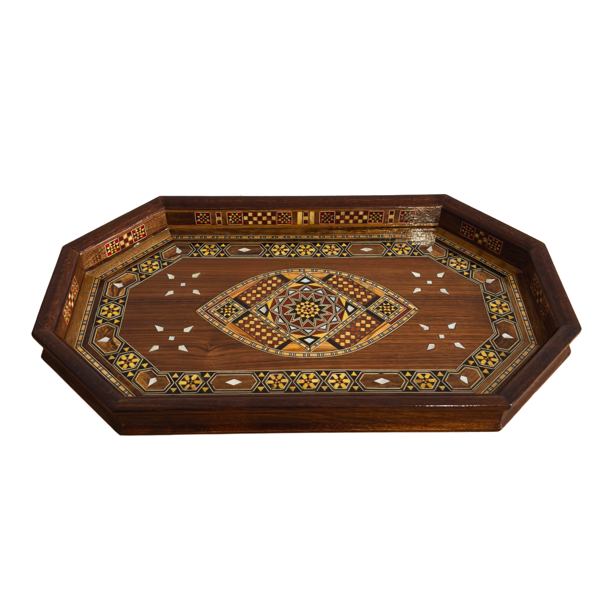 Damascene mosaic tray, octagonal tray, mother of pearl inlay, walnut finish, oriental design, Syrian craftsmanship, handcrafted décor, Damascus Box